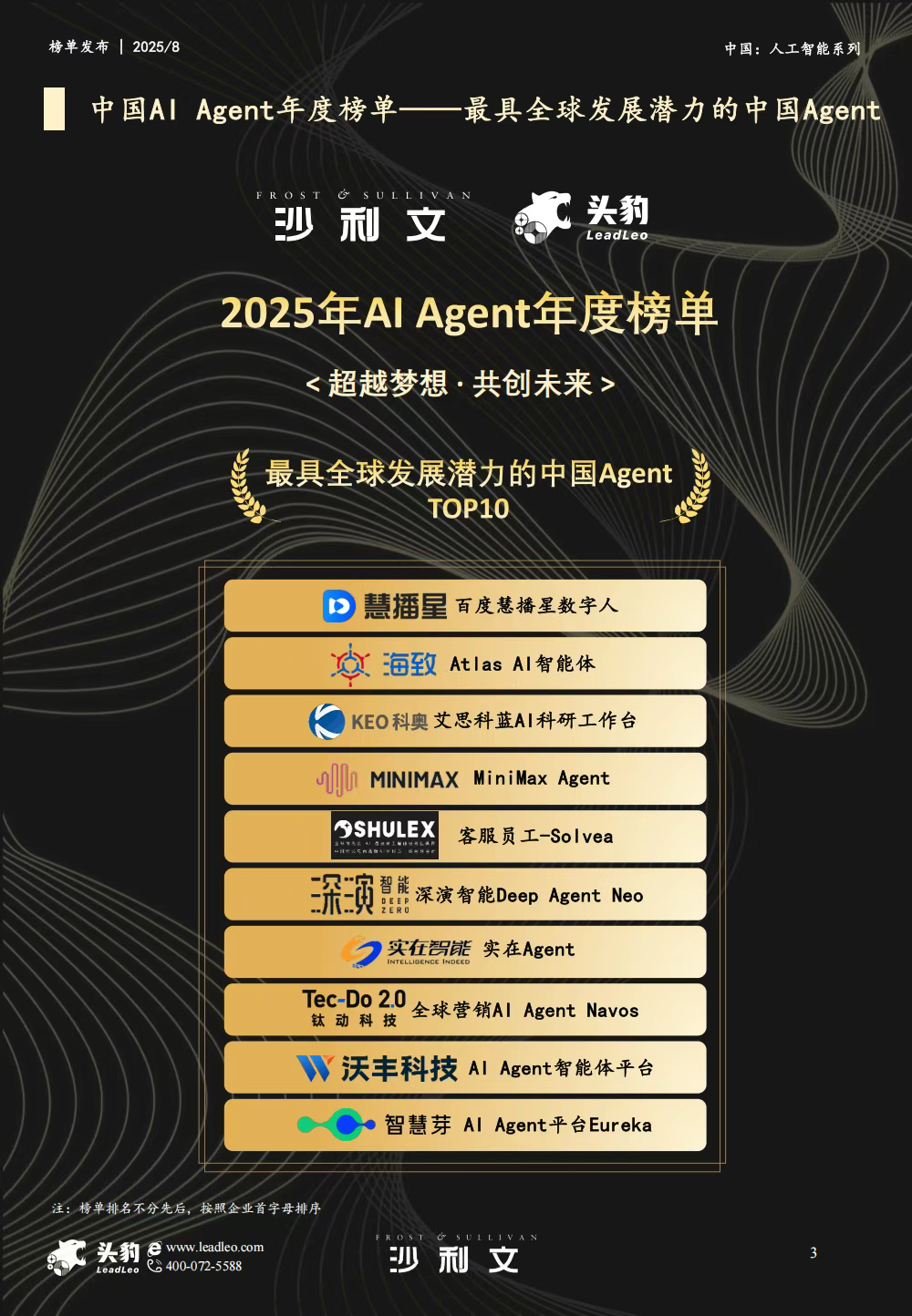 8月28日,全球知名咨询机构沙利文联合头豹研究院发布了《2025年中国AI Agent(智能体)最佳实践应用榜单》,凭借自主研发的 AI 智能体平台 Deep Agent Neo 的突出实力,OG视讯智能从 150 家参评企业、近 300 个产品 / 解决方案中脱颖而出,成功入选 “最具全球发展潜力的中国 Agent” TOP10 榜单,再度印证其在 AI Agent 领域的技术硬实力与全球化发展潜力。